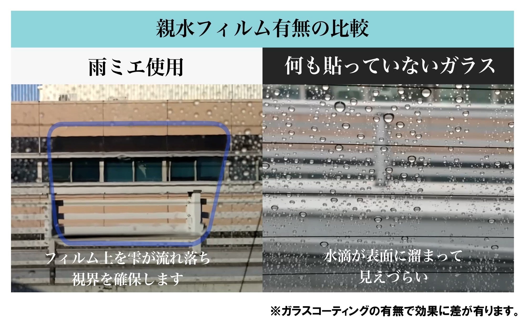 ナノ親水防曇コーティングの特殊フィルムを貼るだけで、水滴が平坦化し、雨天時のドラレコやミラーの視界をしっかり確保します。何も貼ってない状態と比較しても一目瞭然です!