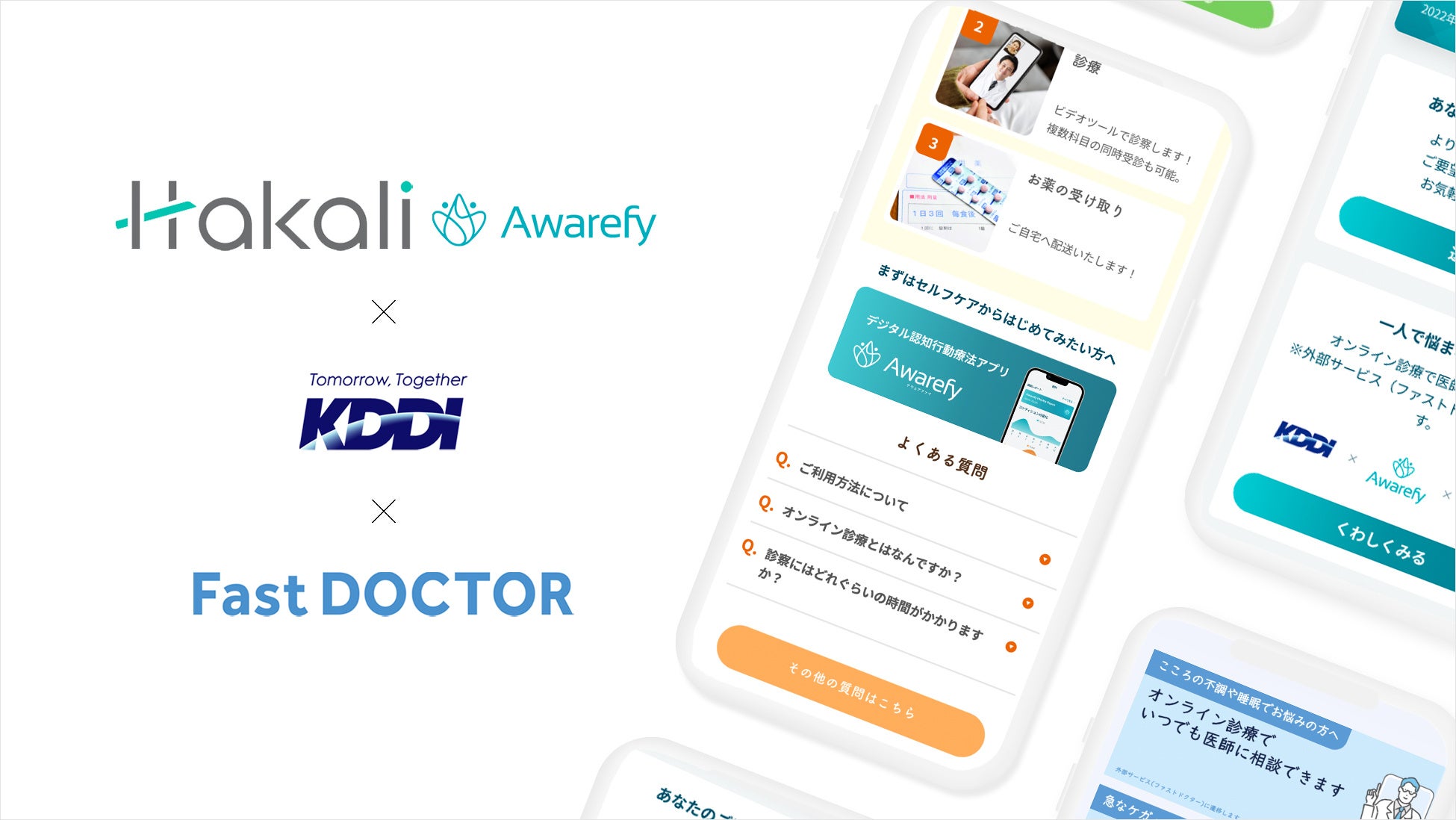 この度、ファストドクター株式会社と、株式会社Hakaliの提携を仲介させていただきました。メンタル領域は医師や医薬品による治療行為に加えて、認知行動療法による日常的なケアも重要であり、今回の2社の提携でより総合的な心のケアが提供できるようになると認識しております。弊社が提供するauウェルネスの「日々の健康活動からいざという時の医療体験までを支援する」というコンセプトとも一致した取組として、両社とともに引き続き新しい価値創造を目指していきたいと考えております。
