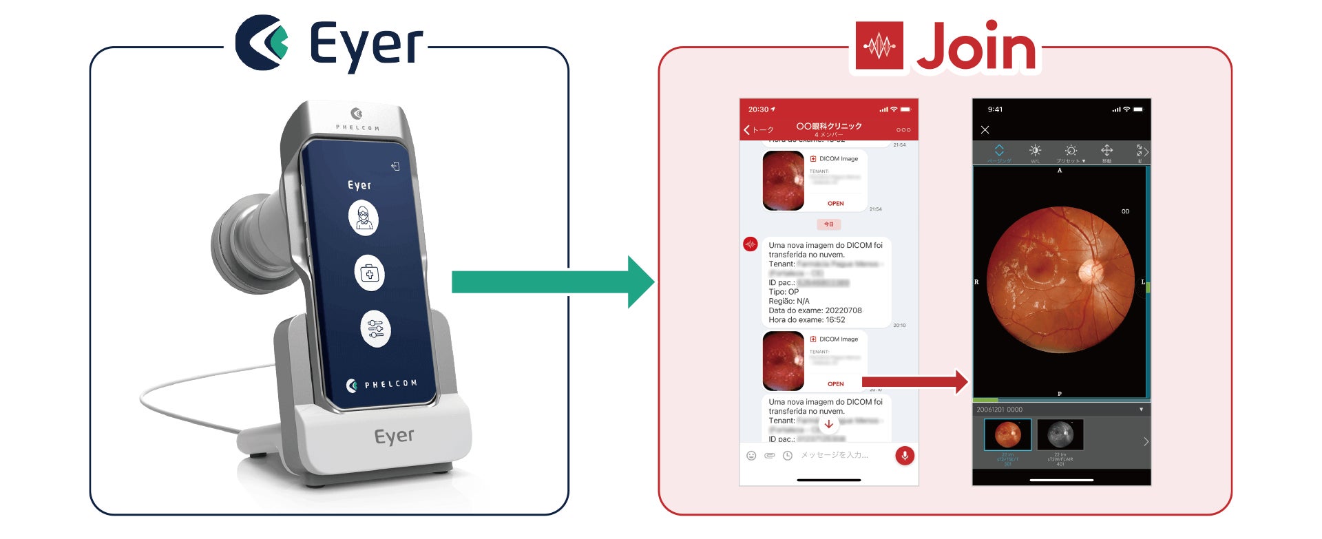 また、アルムが開発・提供する医療関係者間コミュニケーションアプリ「Join」と連携して使用することで、Eyerで撮影した検査画像を遠隔地の医師と共有する「眼科の遠隔診療モデル」を実現できます。例えば、現場の医療従事者がEyerを用いて撮影した検査画像をJoinを通じて遠方の専門医に共有することで、アドバイスを受けることができます。これにより、時間・コスト・距離の短縮を実現し、患者さんのQOL向上に貢献します。