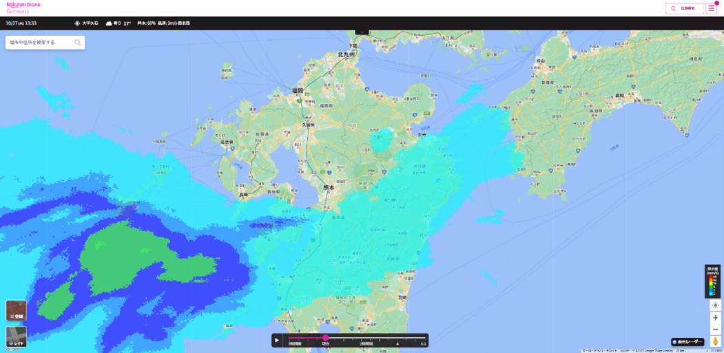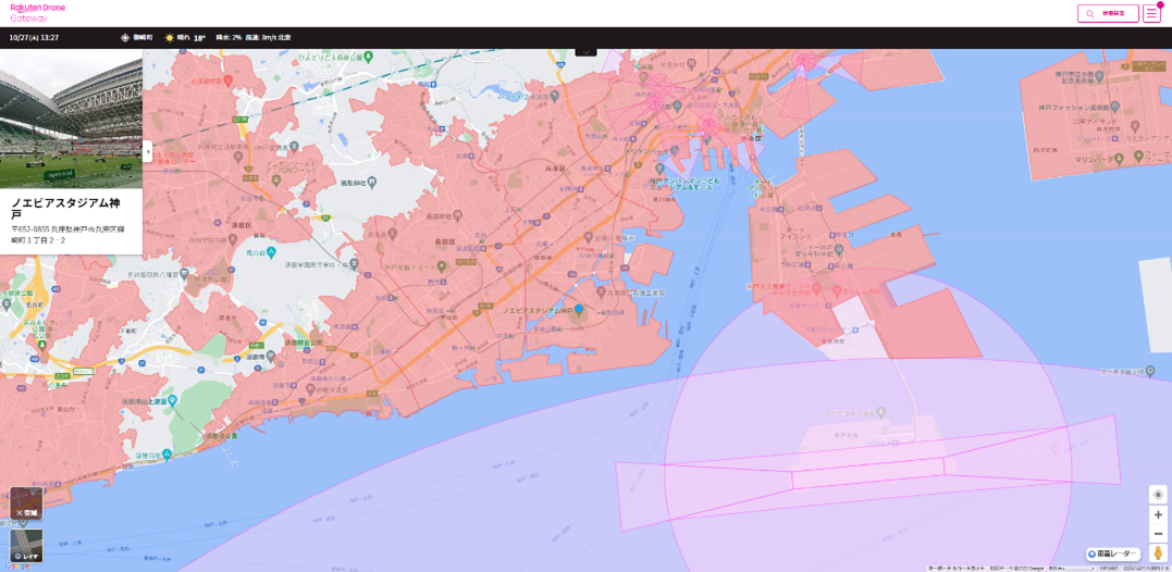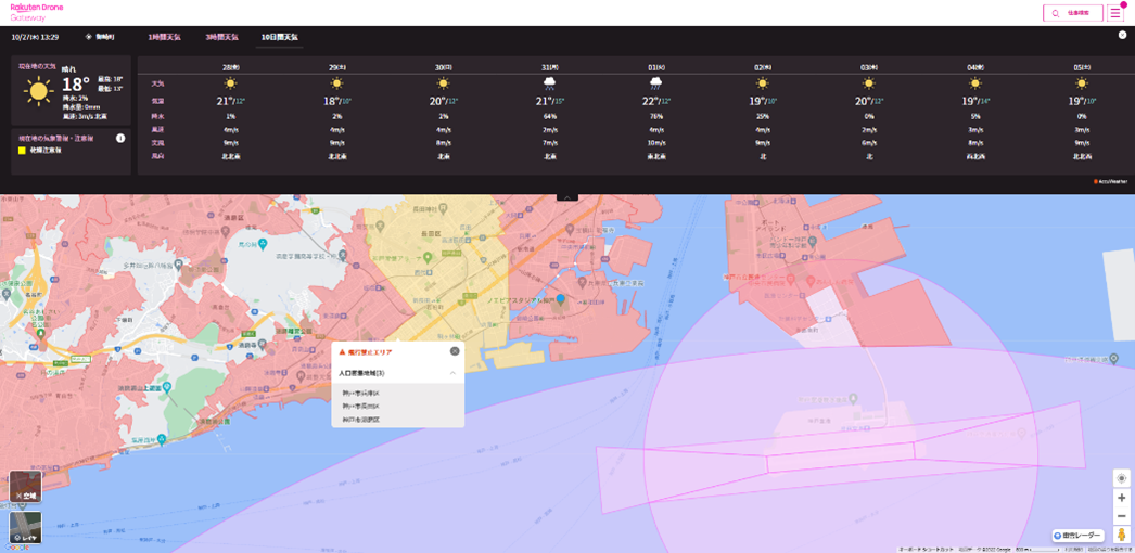 (注6)フライトマップに記載の飛行禁止空域以外でも、飛行の方法に応じて行政や自治体等に申請等を行う必要があります。天気予報、雨雲レーダーの機能の利用には楽天IDでのログインが必要です。また飛行支援機能はトライアル期間として無料で提供していますが、機能の拡充等により変更の可能性があります。トライアル期間の終了時期が決定した場合、楽天より本サービスのユーザーに連絡します。