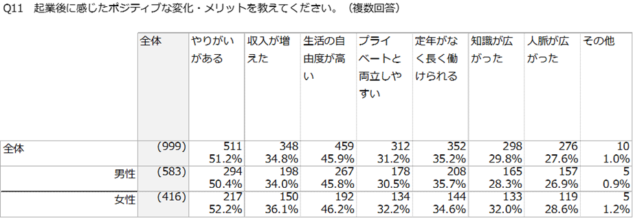 - 起業後に感じたポジティブな変化・メリットは、男女ともに「やりがいがある」がトップに。そのほか、収入増、生活の自由度、定年がないことや知識、人脈の広がりなど多くのメリットを享受。