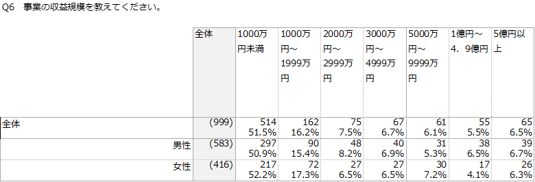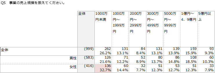 - 事業収益規模は男女共に約半数が「1000万円未満」。「2000万円以上」は男女共に30%台。