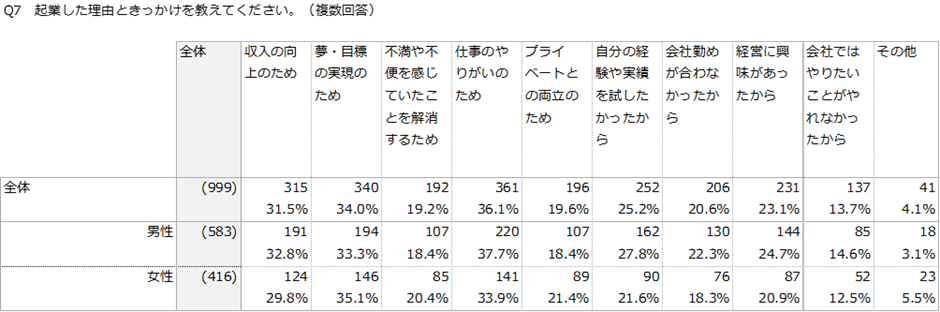 起業家に対して起業した理由ときっかけを尋ねたところ、「仕事のやりがいのため」(36.1%)、「夢・目標の実現のため」(34.0%)、「収入の向上のため」(31.5%)との回答が上位を占めました。女性起業家では、「夢・目標の実現のため」が35.1%と最も高く、「仕事のやりがいのため」(33.9%)、「収入の向上のため」(29.8%)が続きました。なお、「夢・目標の実現のため」と答えた女性起業家の割合は30代が39.7%と最も高く、男性起業家の30代(38.0%)より高い結果となりました。