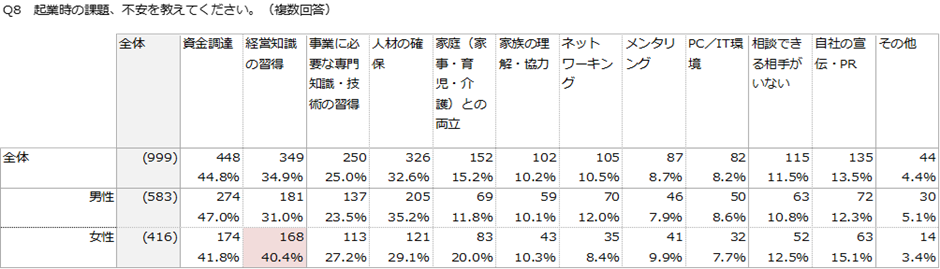 - 起業家が抱える二大課題は、「資金調達」と「経営知識の習得」。「家庭との両立」は男女起業家間で8%程度の開き。
