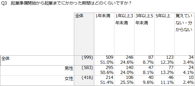 - 起業するまでの準備期間は1年未満が半数。7割強が3年未満で起業。