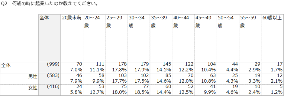 起業した時の年齢を尋ねたところ、30代が最も多く、男性32.1%、女性32.9%でした。続いて20代が男性27.6%、女性30.7%という結果でした。