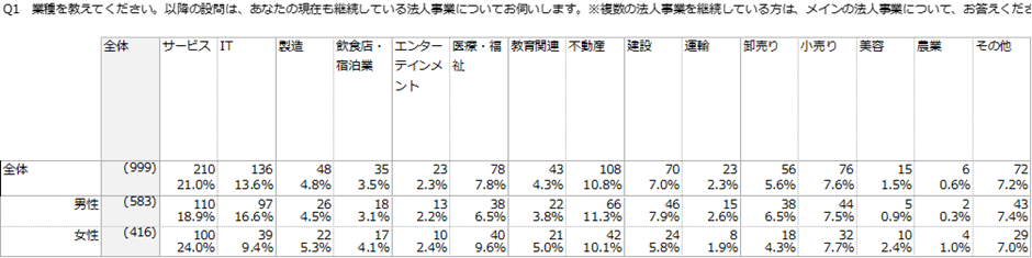 女性が起業した業種は「サービス」(24.0%)が最も多く、「不動産」(10.1%)、「IT」(9.4%)が続く結果になりました。一方、男性のトップ3は「サービス」(18.9%)、「IT」(16.6%)、「不動産」(11.3%)でした。なお、20‐30代で見ると、ITの割合が高まり、同年代の23.8%がITで起業していることが分かりました。