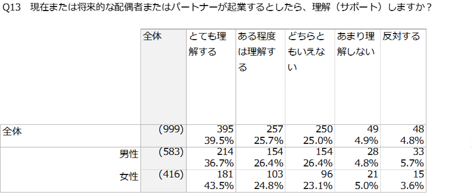 - 女性起業家の7割近くが配偶者/パートナーの起業に理解を示す一方、男性起業家では6割強に留まる。年齢別では、30代女性起業家の8割以上が配偶者/パートナーの起業を理解する結果に。