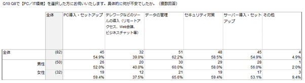 前述した起業時の課題、不安に関する設問において、で「PC/IT環境」を選んだ回答者に具体的に何が不安だったかを尋ねたところ、「データの管理」との回答が男女ともに最も多く6割を超えました。続いてセキュリティ対策が挙げられ、取り扱うデータを堅牢なセキュリティ環境で管理することへの意識の高さがうかがえる結果となりました。一方、PC(54.9%)・サーバー(54.9%)・テレワークなどのツール(39.0%)の導入・セットアップなど全般的に不安を抱えていることが判明しました。