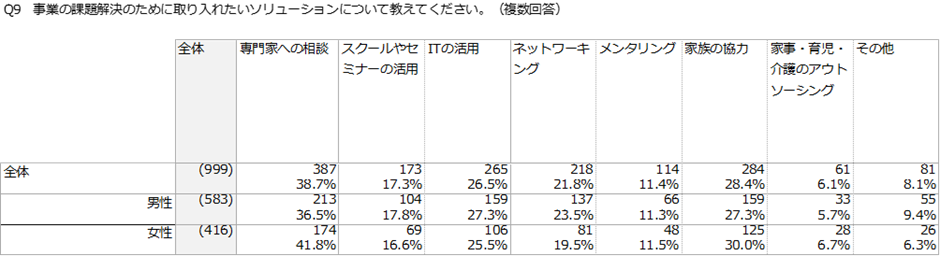 事業の課題を解決するために取り入れたことを尋ねたところ、男女ともに「専門家への相談」が最も高く、男性起業家は36.5%、女性起業家は41.8%となりました。とりわけ30歳未満の女性起業家の割合は37.5%と男性起業家の25.6%と比べて高く、専門家への相談を重視していることが判明しました。男女ともに「家族の協力」(男性:27.3%、女性:30.0%)が続きました。