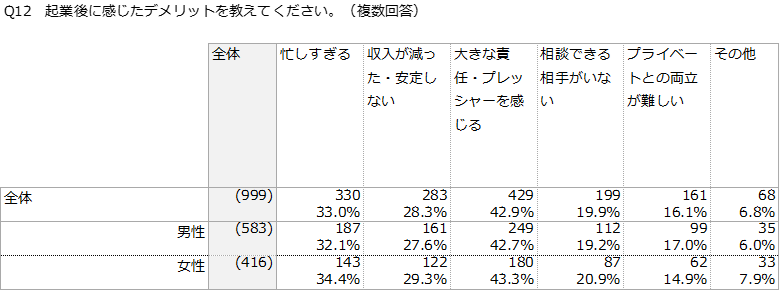 起業後に感じたデメリットについて尋ねたところ、男女ともに「大きな責任・プレッシャーを感じる」が最も多く、42.9%となりました。続いて「忙しすぎる」(33.0%)、「収入が減った・安定しない」(28.3%)がランクイン。また、35歳未満の女性起業家の30.2%が「相談できる相手がいない」と回答し、男性起業家の20.5%を上回る結果となりました。