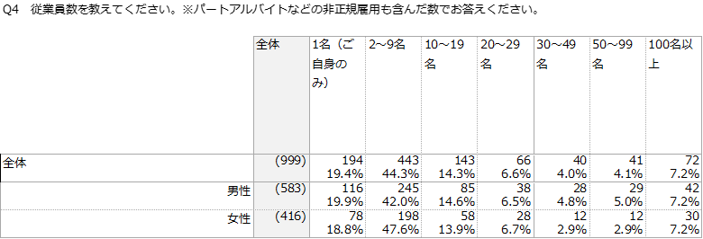 - 起業した事業の従業員数は2〜9名が最も多く、男性42.0%、女性47.6%。