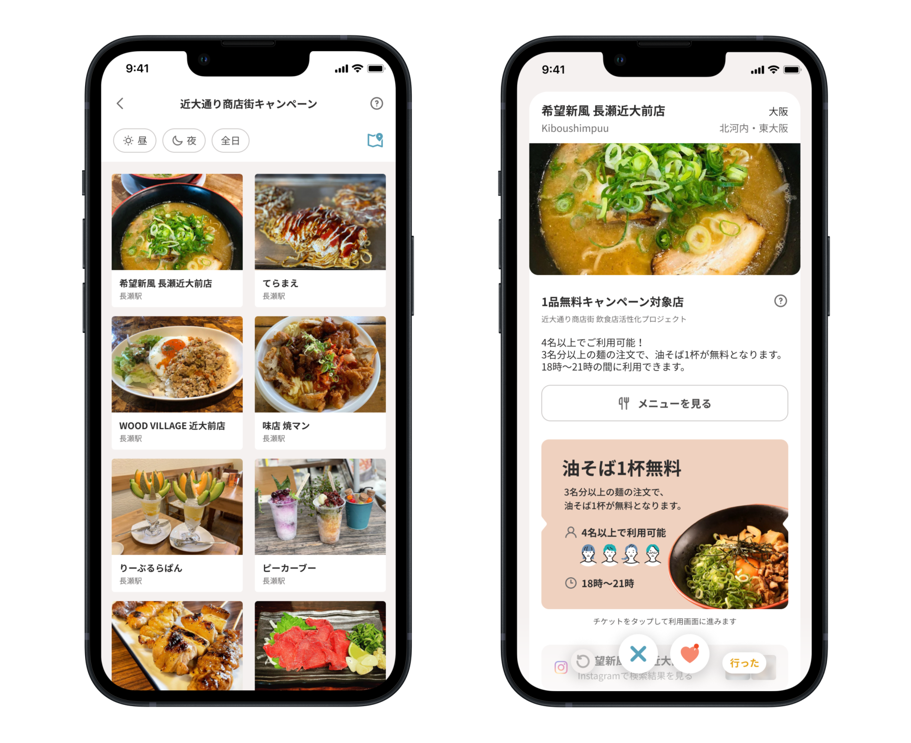 今回のキャンペーンでは、アプリ内に特設ページを作成し、飲食店ごとに用意されたクーポンの提示により、店舗が指定する人数で来店すると、指定の1品が無料になるサービスが受けられます。