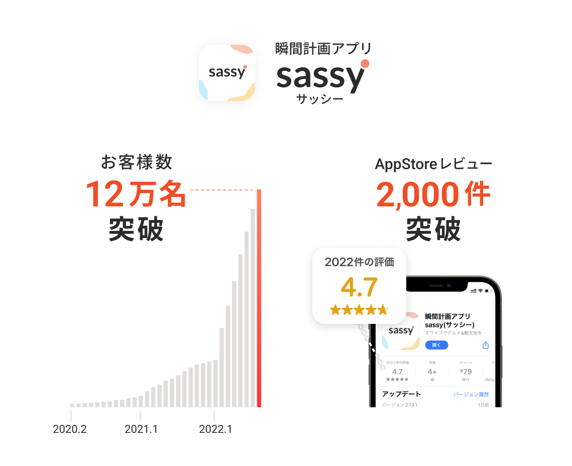 当社が運営しているZ世代向け飲食・観光アプリ『sassy』は、10〜20代を中心に現在13万人以上にご利用頂いているスマートフォンアプリです。