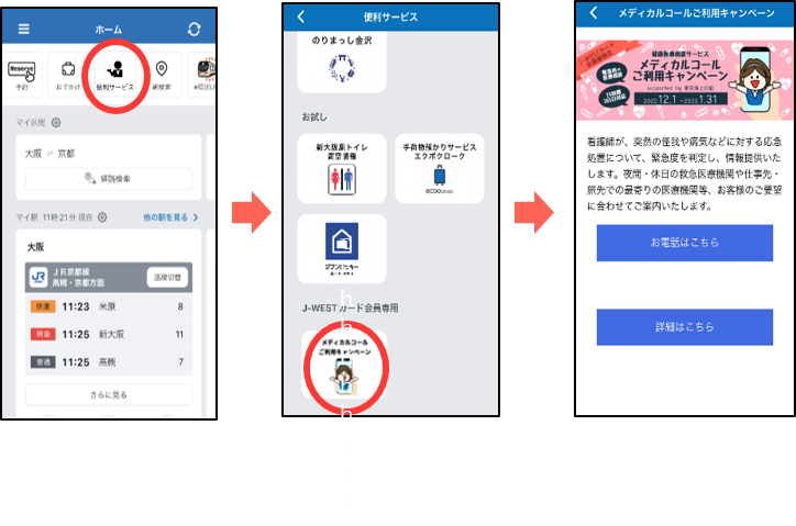 ①JR西日本公式アプリ「WESTER」をダウンロードしていただき、ホーム画面上部の「便利サービス」からメディカルコールのアイコンをタップして、案内に従いご利用ください