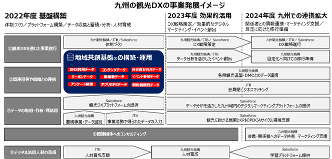 本協定に基づき、1年目にJTBとSalesforceは、Salesforce Service CloudやTableauなどを導入して地域DMO(注2)、運輸局、観光事業者との情報連携を効率的に行うほか、同機構の会員企業との相互利用可能なシステム環境を整備し、各地域の観光DXのモデルとなる「九州観光プラットフォーム」を構築します(JTBの投資開発にて先行して構築)。その後、九州観光機構は、保有する各種事業データを収集、九州観光プラットフォームに蓄積します。並行して、DXの推進体制作り、学習支援、専門家派遣、観光庁事業の取組み、会員組織との連携を進めていきます。2023年度には Salesforce Experience Cloudによるデータ連携やビジネスマッチング、2024年度にはSalesforce Marketing Cloudによるデジタルマーケティングプラットフォームの実現をしてまいります。
