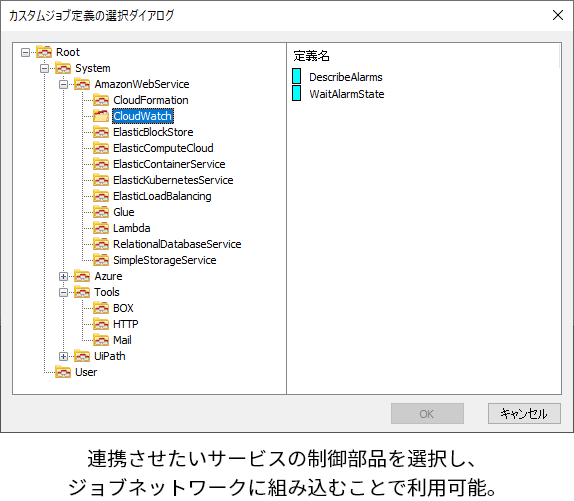 (2) AWS との連携機能を強化Amazon RDS の起動や停止、Amazon EBS のボリュームサイズの拡張やタイプの変更、AWS Lambda 関数実行など 9 サービスに関する連携機能を強化。また、GUI 上で設定可能な専用の制御部品を標準で用意しているため、サービス独自の知識がなくても、業務フローの自動化に組み込むことが出来ます