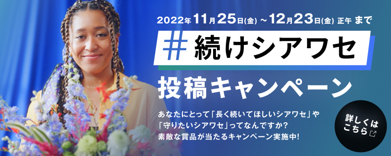 パナソニックグループでは、11月25日(金)から12月23日(金)までの間、Twitter、Instagram、TikTokで「#続けシアワセ」投稿キャンペーンを実施します。長く続いてほしい幸せや、守りたい幸せ ― 皆さまにとっての幸せを写真・動画と共に「#続けシアワセ」投稿キャンペーンのハッシュタグを付けてTwitter・Instagramに投稿することで、キャンペーンに参加することができます。優秀作品に選ばれた方には、なんとパナソニックのブランドアンバサダーの大坂なおみさんから素敵なプレゼントが貰えるチャンスも!