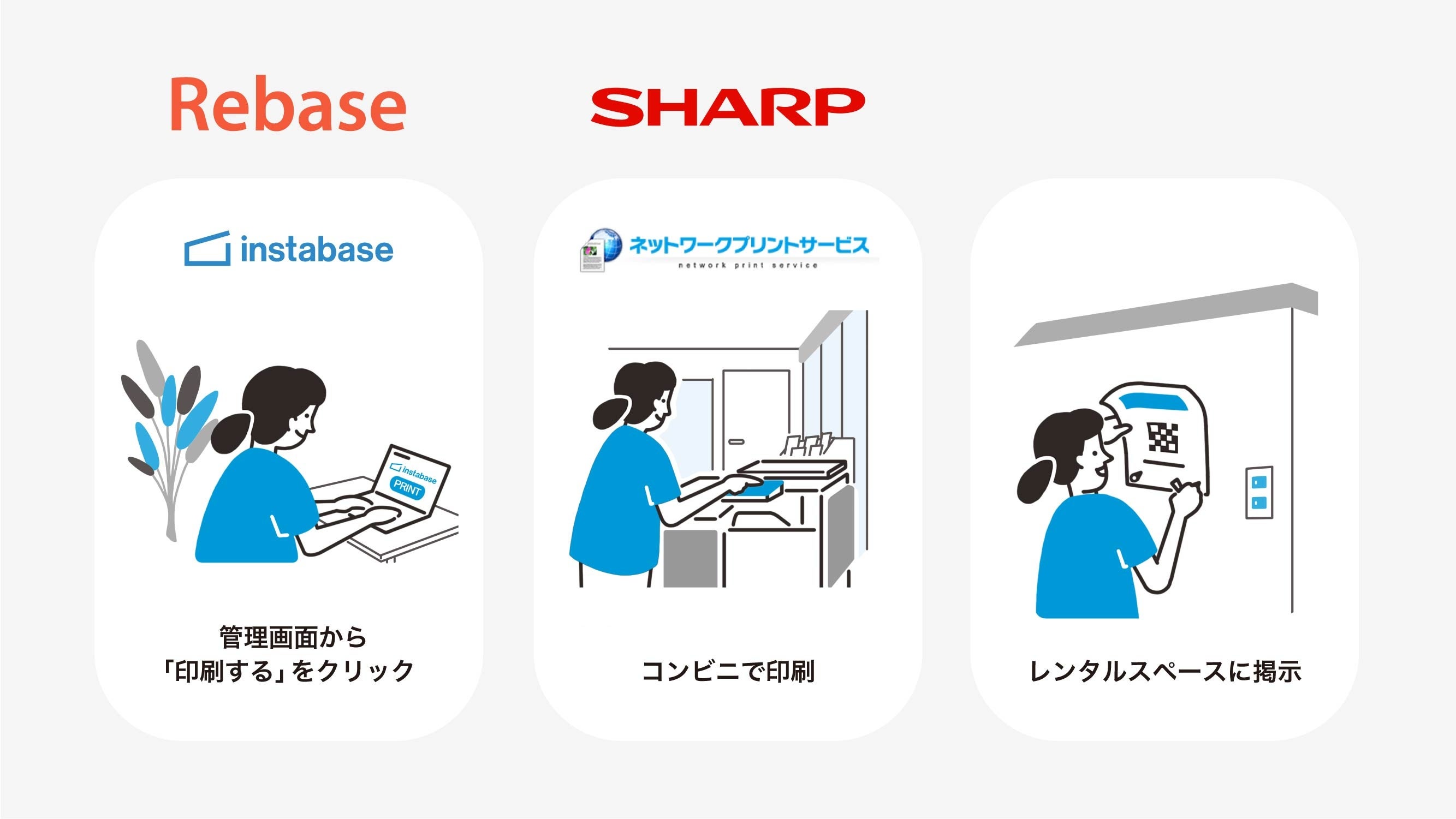 SMJは、全国約30,000店舗のコンビニエンスストア(※1)に設置のシャープ製マルチコピー機で、クラウド上に保存した文書や画像ファイルなどを手軽にプリントできる「ネットワークプリント」サービスを展開しています。一方、Rebaseは、会議室やセミナー会場など、全国25,000件以上のレンタルスペースの予約が可能な日本最大級(※2)の予約プラットフォーム「instabase(以下:インスタベース)」を運営しています。今回の連携では、両社のサービスプラットフォームを相互に活用することで、「インスタベース」にレンタルスペースを掲載する人(以下、掲載者)のプリントニーズに応え、運営の効率化や負荷低減に繋がるサービスを提供します。