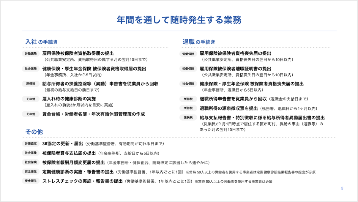 毎月の社会保険料や住民税の納付、随時発生する入退社手続きなど、人事労務の仕事は多岐にわたります。労働保険料の年度更新や年末調整といった、年に一度だけ発生する業務も多く、担当者は繁忙期を見越したスケジュール管理を行うことが大切です。