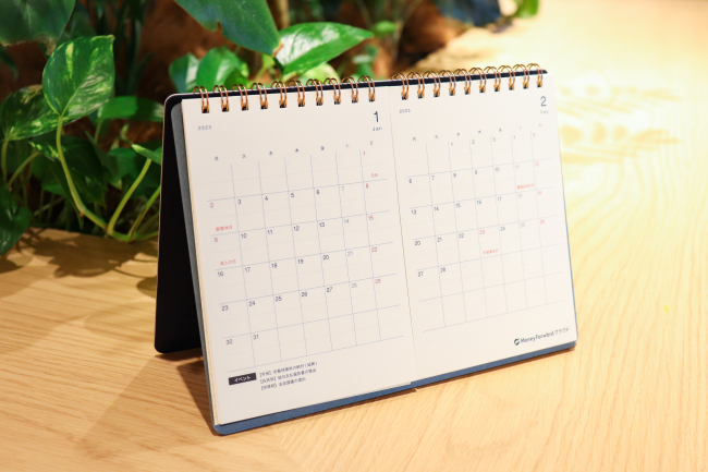 最近はウェブカレンダーでスケジュール管理をされている方も多い中、卓上カレンダーは、手元ですばやく予定を確認したり、メモを記載したりする際に役立ちます。深みのあるシックなブルーの表紙に、マネーフォワードのコーポレートカラーであるオレンジのゴムバンドを合わせ、機能性だけでなくデザイン性も追求しました。