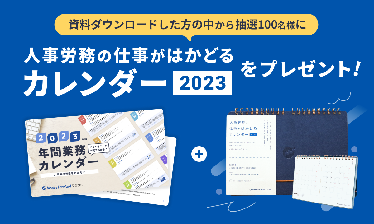 現在、「2023年版 人事労務担当者のための年間業務カレンダー」資料をダウンロードしていただいた方の中から抽選で「人事労務の仕事がはかどるカレンダー2023」を100名様にプレゼントするキャンペーンを実施中です。応募の際は、下記ページから、資料ダウンロードフォーム内の応募規約をご確認の上、必要事項をご入力ください。