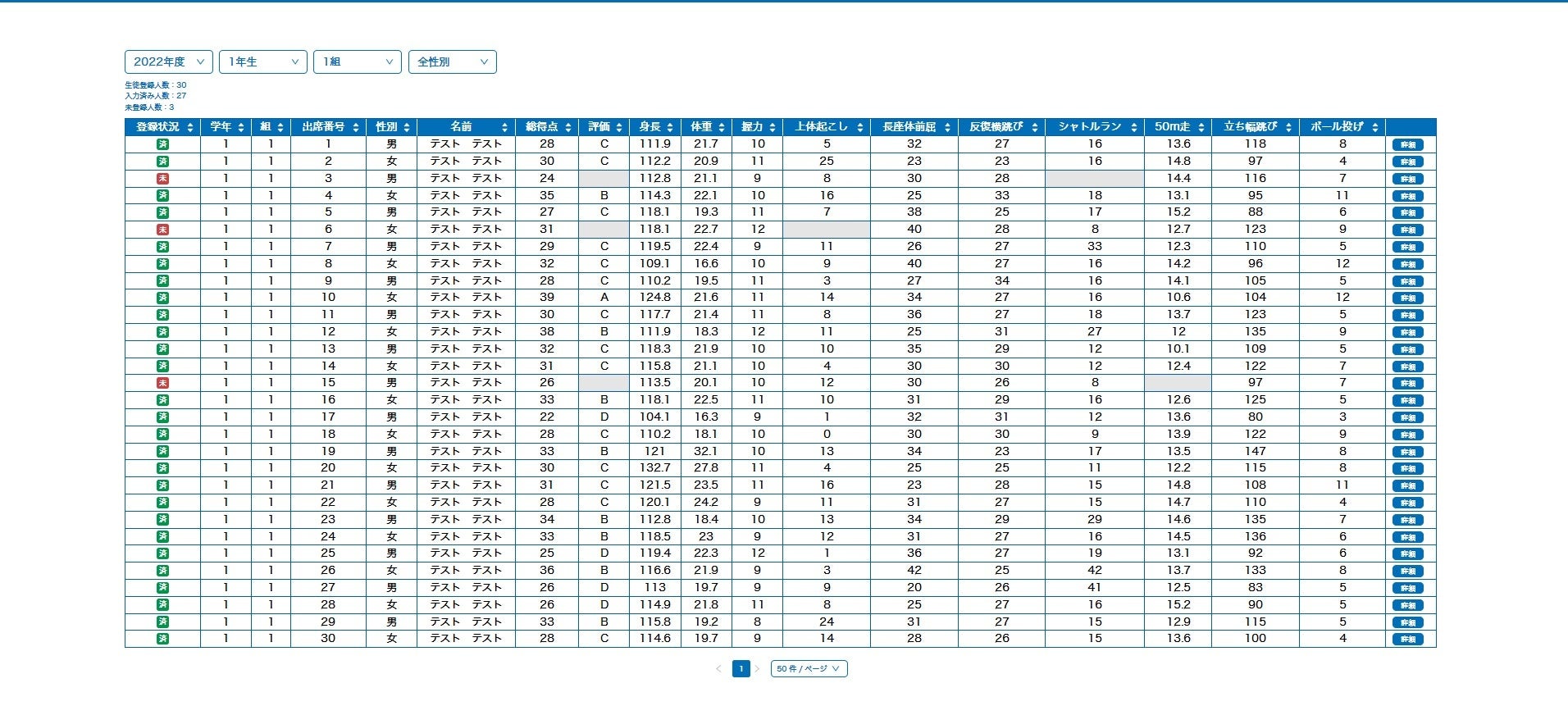 従来の確認作業は、記録用紙1枚ずつ記入ミスや抜き漏れがないかを確認していました。これに対し、『ALPHA』では教員用ページで登録状況を確認することができます。また、測定結果の入力範囲の設定があるため原則誤入力は起こりません。