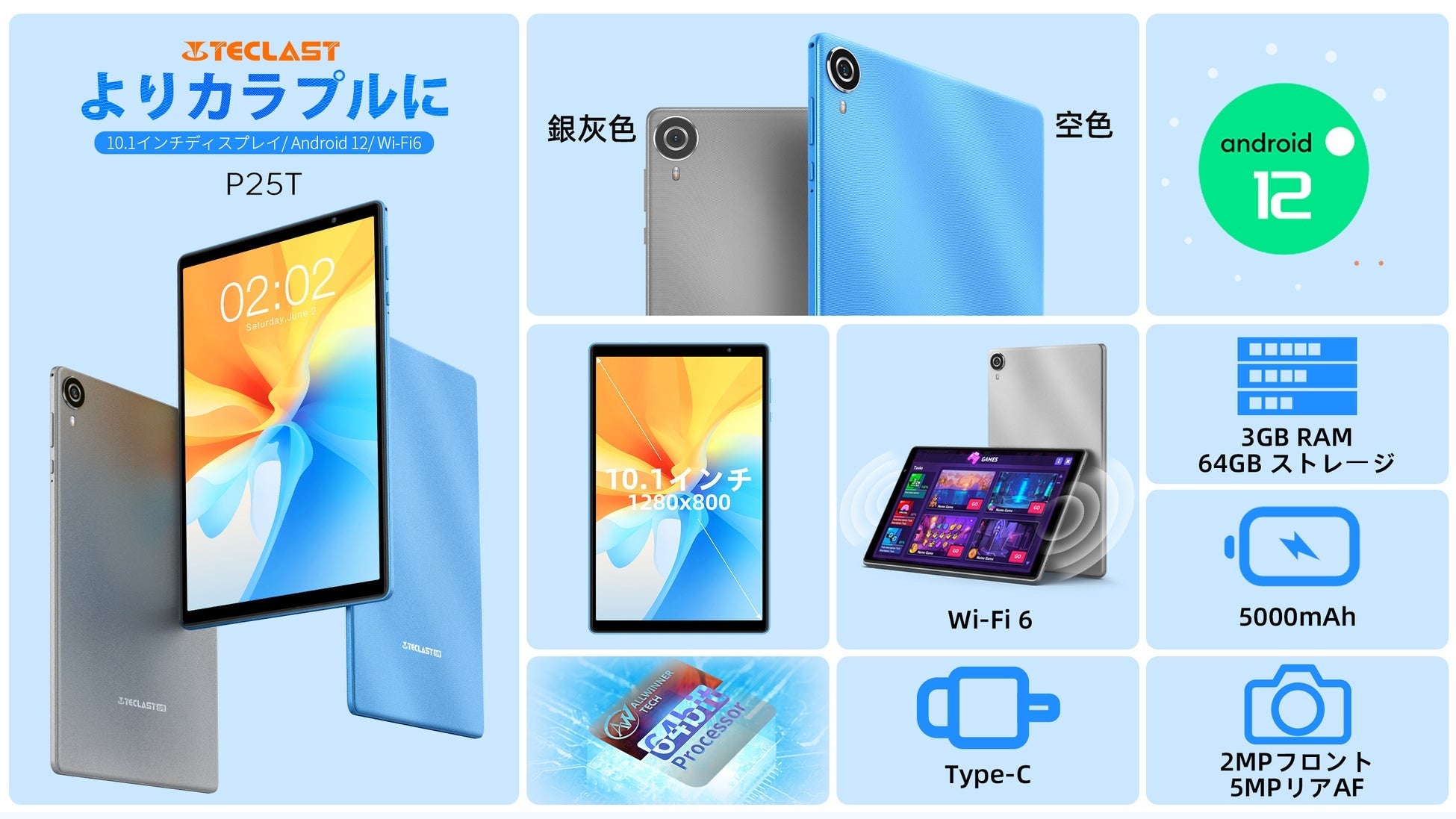 1280×800 HD解像度の10.1インチIPS 178°ワイドビューアングルディスプレイが搭載されているため、ゲームやビデオで優れたビジュアル体験が得られます。「P25T」は、Wi-Fi5より高速で大容量で低遅延の超高速Wi-Fi 6をサポートしています。エネルギー効率の高いBluetooth対応5.0により、ワイヤレスヘッドフォンで優れたオーディオを楽しむことができます。