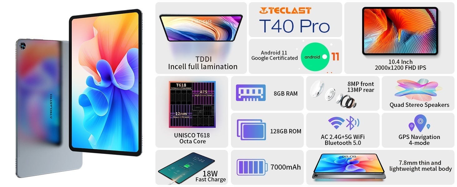 Teclast「T40 Pro」は、CNC機械加工されたアルミニウム製のユニボディエンクロージャー設計で構成されており、強く、軽く、耐久性があります。10.4インチの2Kベゼルレス、BOEテクノロジーによって提供されるディスプレイは、TDDIテクノロジーを使用して、レイヤーを追加したり、反射を減らしたり、タッチ応答性を向上させたりすることなく、タッチセンサーをLCDの既存の構造に統合します。 T-Color 2.0色最適化アルゴリズムにより、色が画面から飛び出します。
