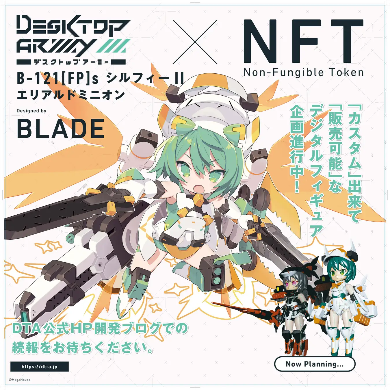 今回始動するNFTプロジェクトの第1弾として、メガハウスが2016年から展開しているオリジナルコンテンツ「デスクトップアーミー (以下DTA)」のフラグシップキャラクターである「シルフィーⅡ」の3DフィギュアデータをNFTとして販売します。