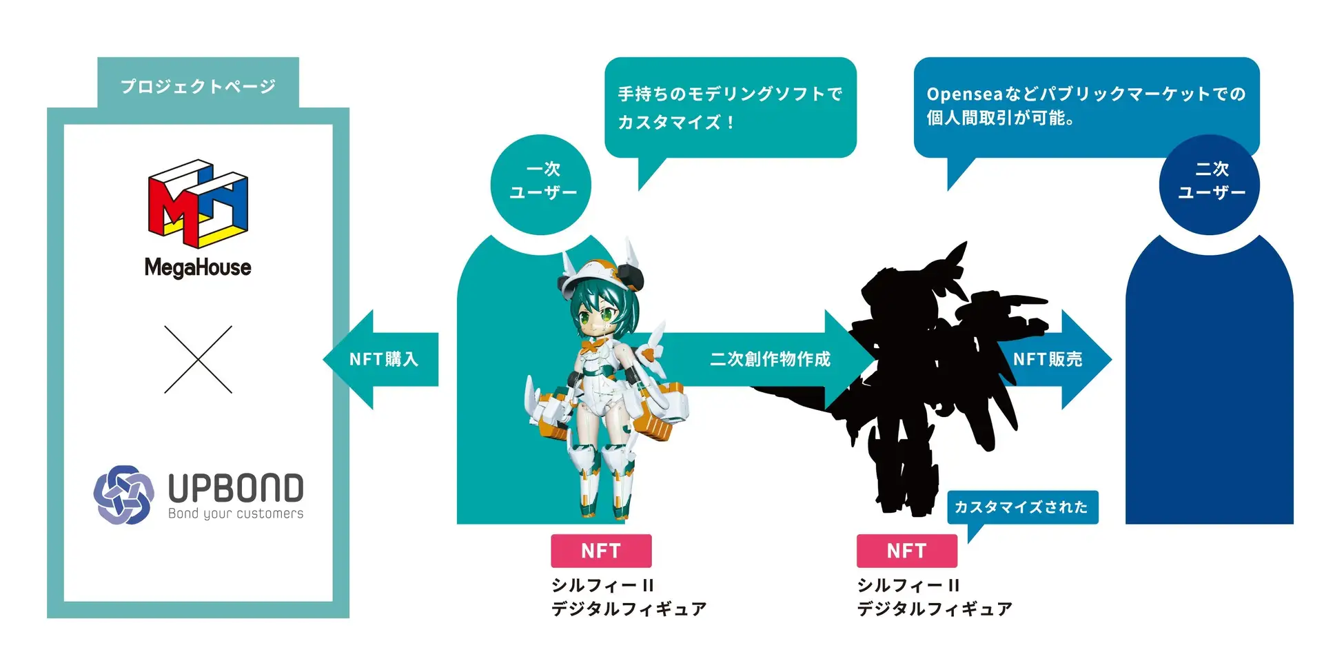 NFTを購入したユーザーは3Dフィギュアデータをカスタマイズし、自身で楽しむだけでなく、プロジェクトページを通じてマーケットプレイスで販売することが可能となります。、コンテンツホルダーが公式に認めた画期的で全く新しいIPコミュニティ形成の場の提供を予定しています。