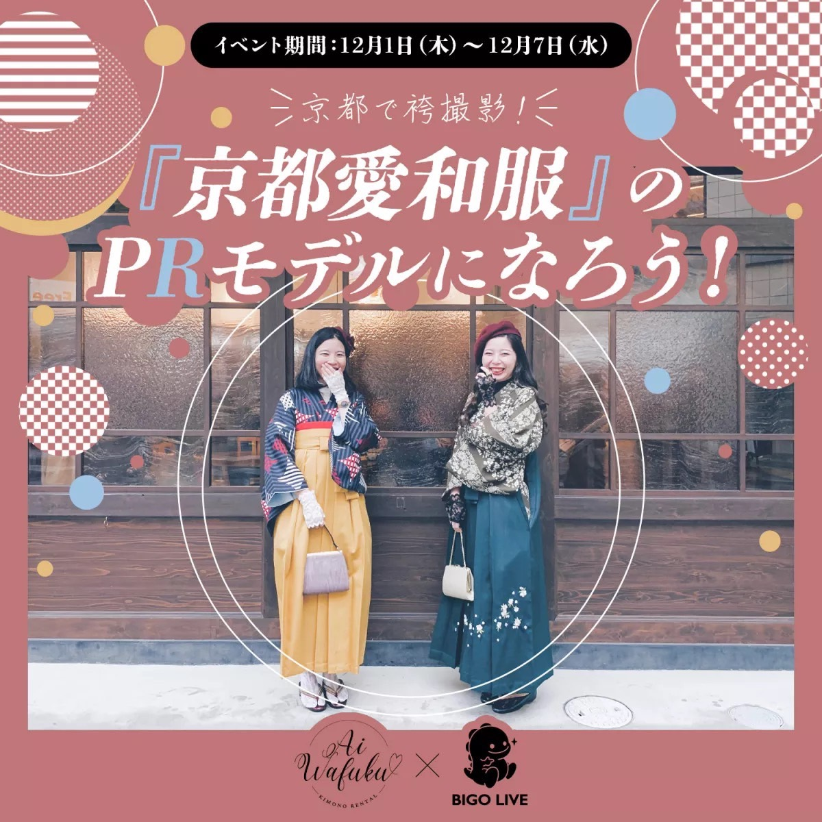 同イベントは、ライブ配信アプリ「BIGO LIVE」内で、期間中毎日開催。イベント参加者は、アプリ内のオーディエンスに向かって、スマホで配信を行うことで得る獲得ポイントの総合点で、順位を競い合います。上位入賞者は、「浅草愛和服」のPRモデルとして起用され、渋谷ビジョン出演権利、公式SNS掲載の賞品が授与されます。また、入賞したライバーには浅草と京都の店舗にて使用可能な「着物レンタル年間パスポート」プレゼントもされます。『京都で袴撮影!『京都愛和服』のPRモデルになろう! 』(開催日時:2022年12月1日〜12月7日)