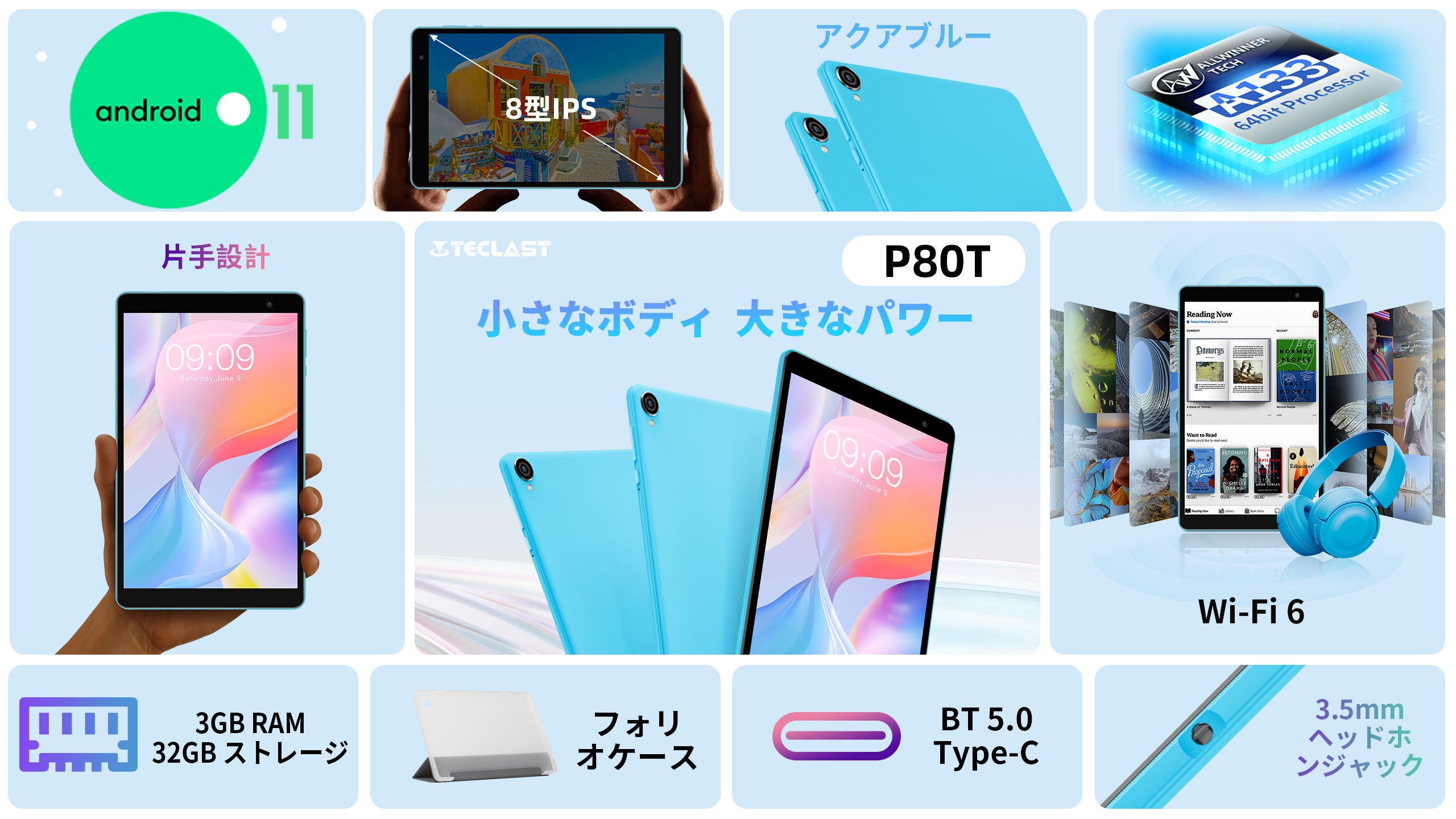 Teclast「P80T」は、8インチのコンパクトさに超薄型の6mmベゼルを設計、簡単に片手で取り扱う可能です。重量はわずか310gで、軽量でポータブルです。鮮やかなアクアブルーデザインを採用し、厳選された色で仕上げて、野外使用時明るくて注目、魅力で個性です。