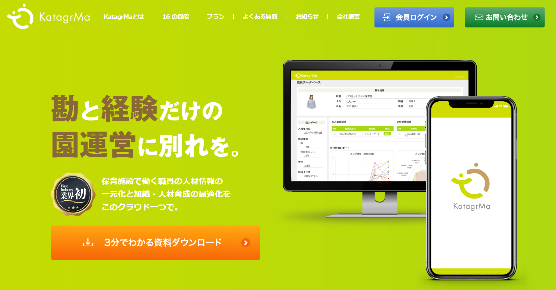 これまで誰に教えられることもなく、勘と経験だけを頼りに園運営を行ってきた保育施設の組織・人材育成を、一元管理、見える化、効率化、そして個別最適化することができるのが、業界初の組織・人材育成クラウド「KatagrMa -カタグルマ-」です。