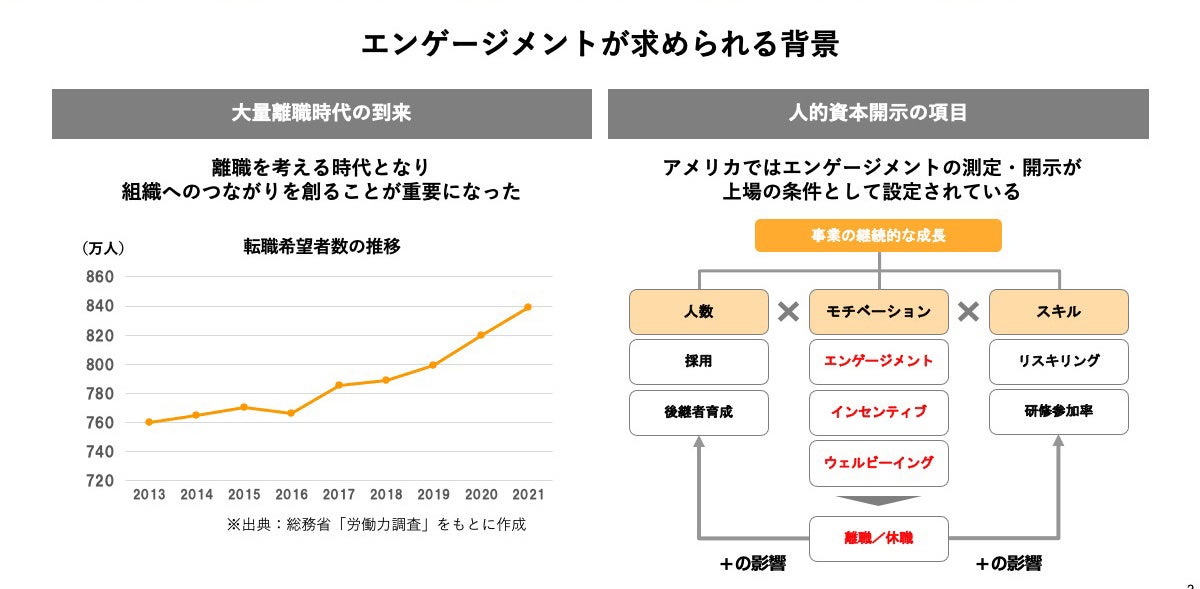 昨今、個々の働き方は多様化し、副業する社員や転職希望者が増加する中、企業はいかにして、社員との“つながり”を強化、企業内での社員個々の成長、“働きがい”“幸福度”“満足度”などのエンゲージメントを向上させることが重要となっています。