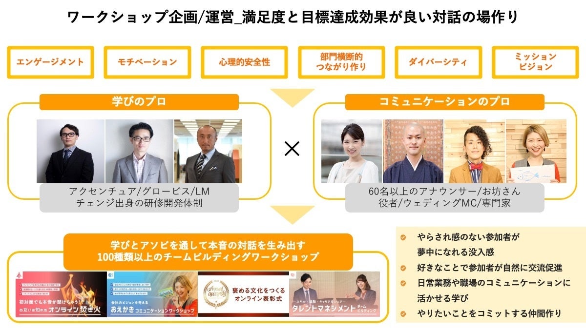 「バヅクリ エンゲージメント」のワークショップでは、コンサルティングと研修プログラムと、60名以上のアナウンサー、お坊さん、役者、ウェディングMCなど“コミュニケーション専門講師”による「バヅクリ」ならではの“本音の対話を生み出す”100種類以上のチームビルディング・プログラムを軸に、“学び”と“アソビ”を通して、楽しみながら社員間の関係構築と意識/行動変容、かつ会社と社員個々が深い関係を構築できる場を作り、会社全体がより一体感をもって事業に取り組める環境を構築します。
