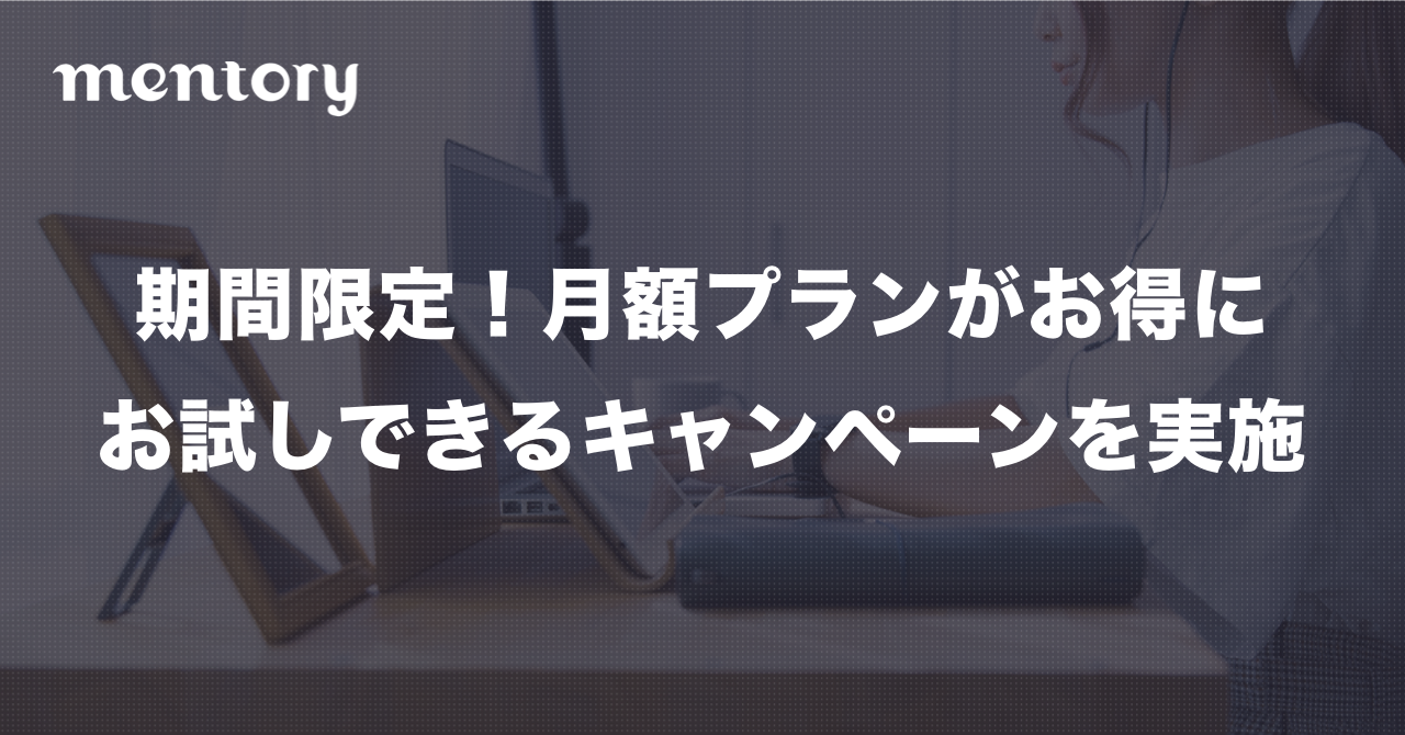 メンタリー株式会社(本社:京都府京都市、代表取締役社長:今谷 祐通)はエンジニア相談サービス「mentory」において「期間限定!月額プランがお得にお試しできるキャンペーン」を開始いたしました。