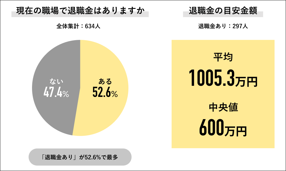 現職での退職金有無について、52.6%が「ある」と回答し、「ない」と回答したのは47.4%でした。また、退職金があると回答した297人にその目安金額を聞くと、平均で「1,005.3万円」で中央値は「600万円」でした。