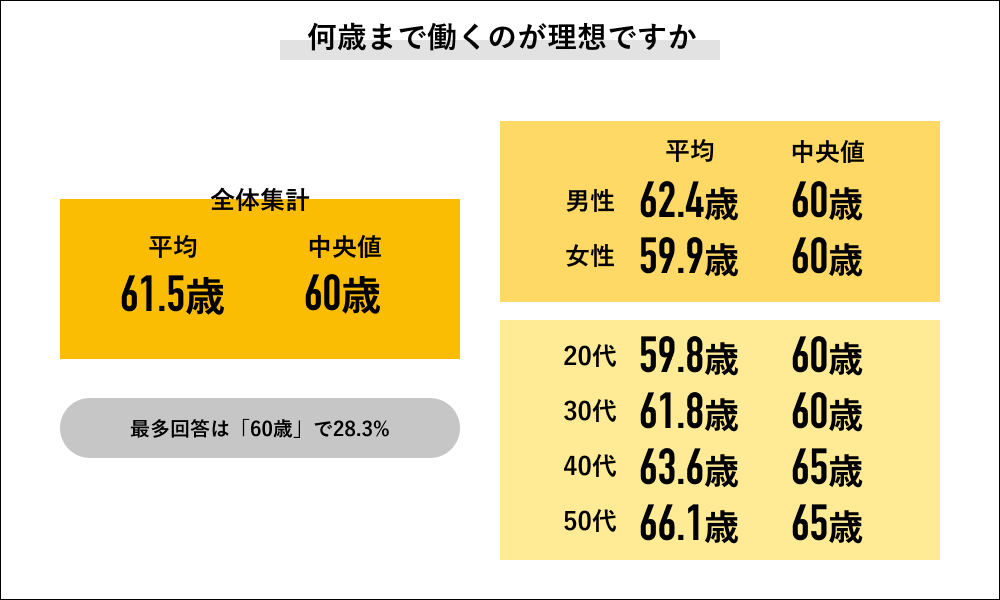 何歳まで働いていたいかを聞くと、全体での最多回答は「60歳」で、記述回答による具体的年齢を集計した結果、平均は「61.5歳」で中央値は「60歳」でした。またこれを男女別回答で見ていくと、男性の平均は62.4歳で、女性の平均は「59.9歳」になり、どちらも中央値は「60歳」でした。さらに年代別では年代が上がると働いていたい年齢も上がる傾向が見られ、平均で最も高い年齢になったのは50代で「66.1歳」になり、中央値は20代・30代が「60歳」で、40代・50代は「65歳」でした。