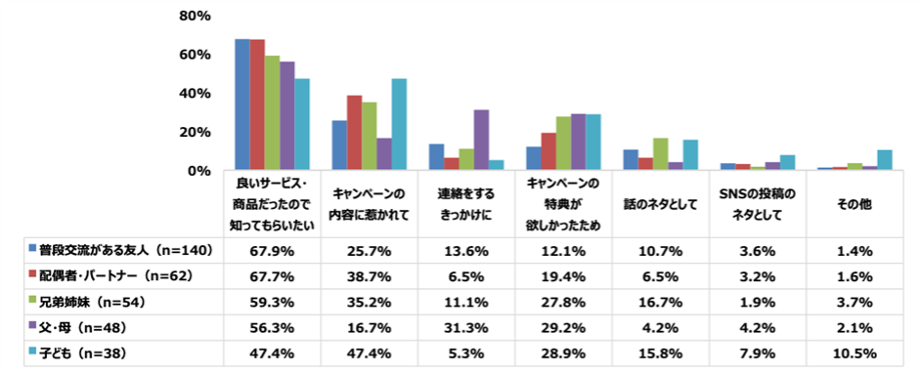 紹介キャンペーンに参加した理由について、紹介した相手に関係なく「良い商品・サービスだったので知ってもらいたい」という回答が最多に。キャンペーンの特典欲しさだけで参加しているというよりは、純粋に自分が良いと感じた商品・サービスを誰かに紹介したいと考える人が多いようです。