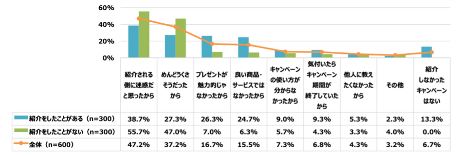 これまで見かけた紹介キャンペーンで、参加しなかった理由について調査すると、「紹介される側に迷惑だと思ったから」が全体の47.2%と最も多い結果に。次いで37.2%が「面倒くさそうだったから」と回答しました。