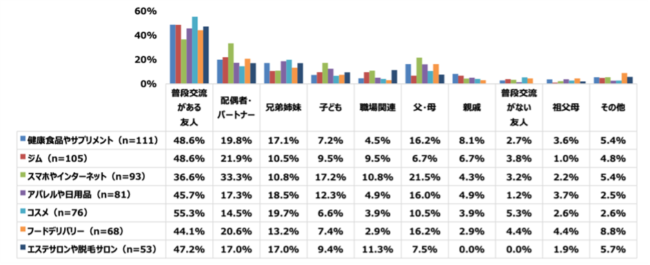 一方、紹介した商品・サービスの項目別で比較すると「スマホやインターネット」は「普段交流がある友人」に紹介した割合が他の商品・サービスに比べてやや少ないが、「配偶者・パートナー」「父・母」に紹介した割合は他の商品・サービスと比較してより多く占めていることが分かります。スマートフォンの通信プランや、インターネット回線の契約は「家族割」などの割引プランを提供しているサービスが多いためか、生計を共にする相手へ紹介するケースがより多く見られました。