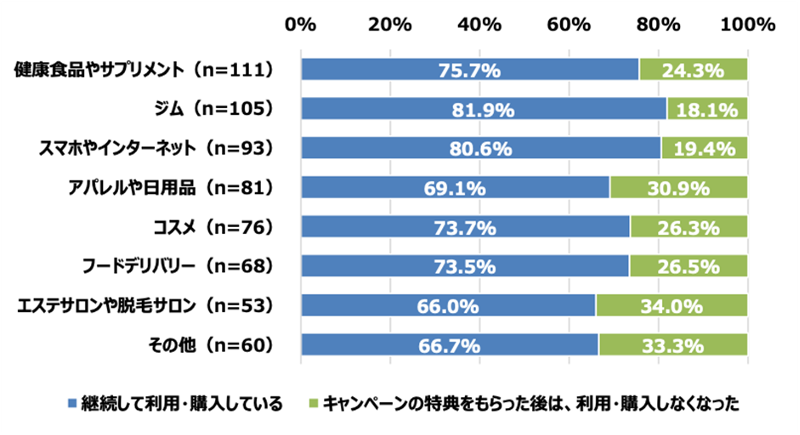 キャンペーンで紹介した商品・サービスの特典をもらった後も引き続き利用しているか質問したところ、大半が「継続して利用・購入している」と回答しました。