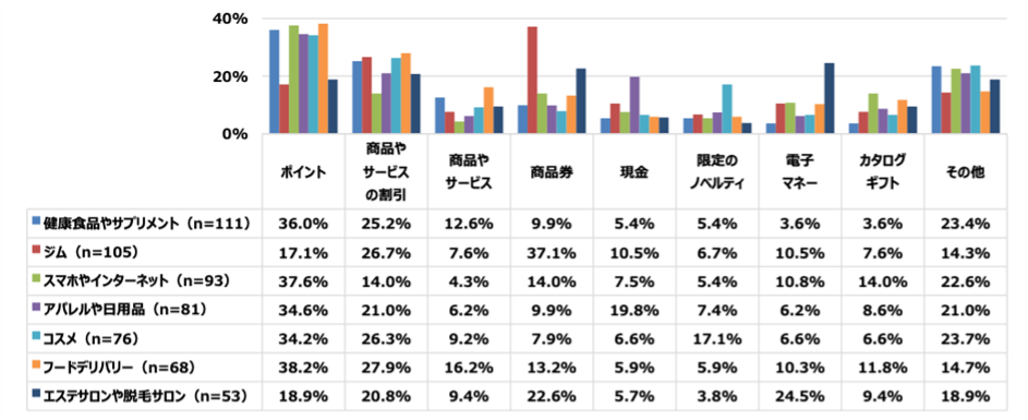 紹介キャンペーンで受け取った特典について調査したところ、「ジムの入会」と「エステサロンや脱毛サロンの契約」に関しては「商品券」や「電子マネー」、その他の商品・サービスは「ポイント」や「割引」が特典であることが多い傾向にありました。