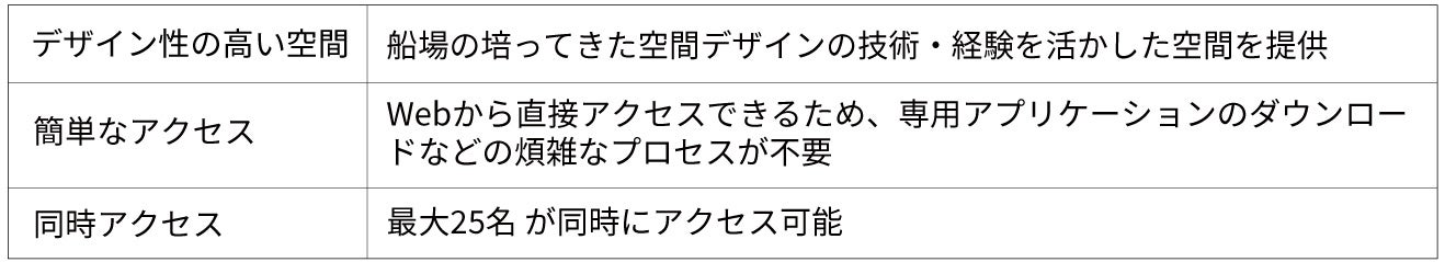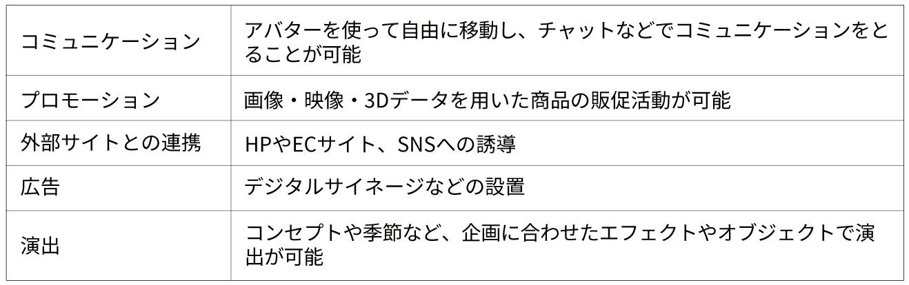 「Vterior™」は、以下の機能を備えたデザイン性の高い空間を提供します。このバーチャル空間の中で、イベント、ショップ、ショールーム、工場見学、宿泊体験等、様々な用途でご活用いただけます。