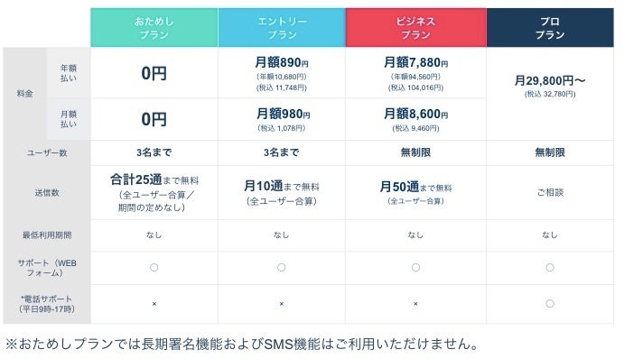 「おためしプラン」は利用期間の制限がなく、ユーザー数3名までで、送信数を全ユーザーで25通までお試しいただけます。