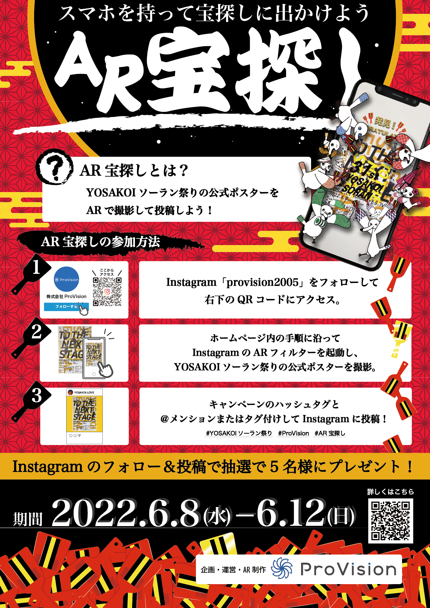 YOSAKOIソーラン祭りには、全国各地から200チーム以上、2万人を超える方々が来場します。イベント会場や出展されるブースには、毎年家族連れや学生など幅広い年齢層の方々が観覧に訪れています。ProVisionは本イベントへの協賛に際し、得意とするAR技術を活用した企画を検討しておりました。さらにコロナ禍での開催ということもあり、非接触でも楽しむことができ、かつ子供から大人まで楽しめる企画を検討した結果、この度の「AR宝探し」実施に至りました。