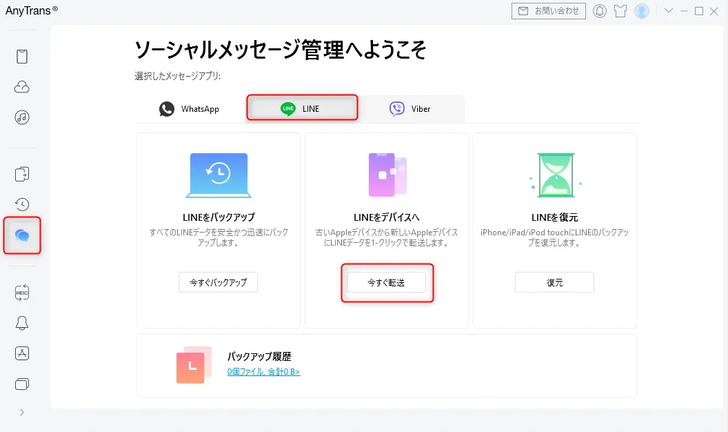 Step3、左のメニューから「ソーシャルアプリのデータ移行」を選択 > ソーシャルアプリの種類で「LINE」選択 > 「LINEをデバイスへ」機能で「今すぐ転送」ボタンをクリックします。