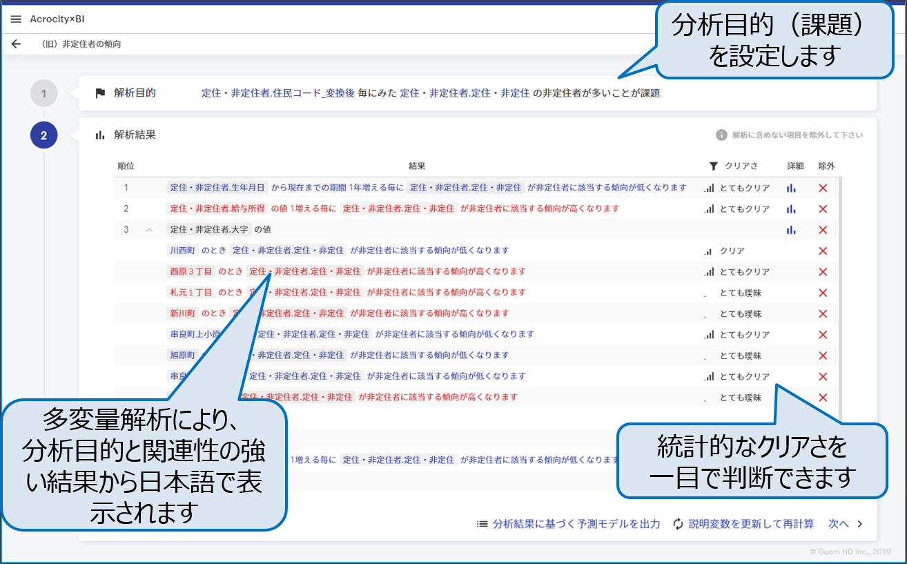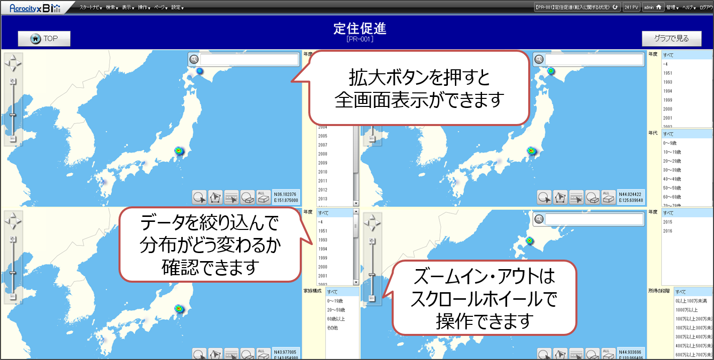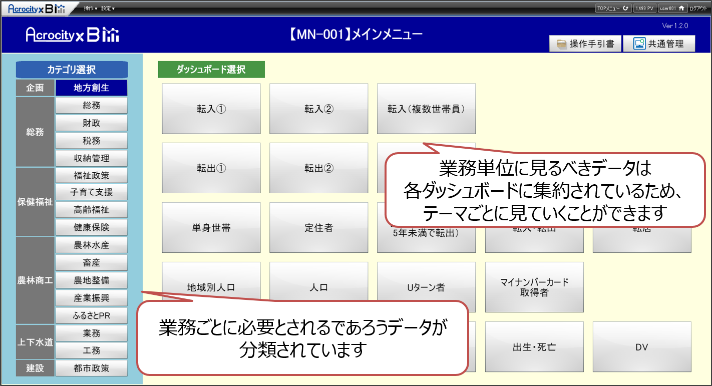 「Acrocity×BI」は地方自治体の住民データを匿名化し、グラフやマップを自動生成するEBPM支援ツールです。基幹情報システムと接続することにより住民情報、福祉情報、水道情報、内部情報など多岐に渡るデータを自動集計し、部局横断で集計結果を見える化することにより、データリテラシーが低い職員でもデータの利活用が可能となります。また、相関関係と因果関係の両面から分析する機能を有していることにより、データサイエンティストがいなくても統計学的に大事なところだけを「日本語で」解析することができます。
