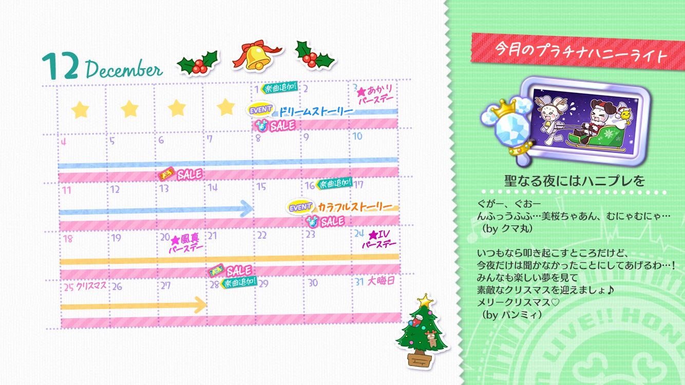12月はクリスマスにちなんだイベントが盛りだくさん!ストーリーイベントでは、YUIを主役にFull Throttle4のメンバーが年末のスーパーライブに出演する様子を描いた『WAY OF FT4~ドリームストーリー~』の開催や、聖奈と翠の2人がクリスマスを一緒に過ごす様子を『聖なる夜は君のため~カラフルストーリー~』としてお届けいたします。
